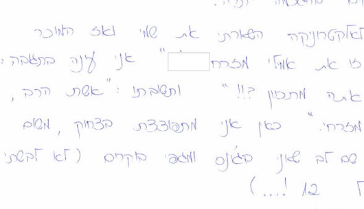 שימו לב לקטע המצורף. הכתב מאוד בהיר וברור, קל לקריאה ולהבנה. כדי להיות בטוחה שאכן יבינו אותה, הכותבת עושה דבר נוסף מעבר לעיצוב הקריא: היא מוסיפה ניקוד, סוגריים ועוד סימנים נוספים בשאר חלקי הכתב. בסוף הכתב הכותבת חותמת בשמה המלא ובאופן ברור. חתימה זו מעידה על כך ש"תוכה ככברה". היא אינה מנסה ליצור מצג שווא.