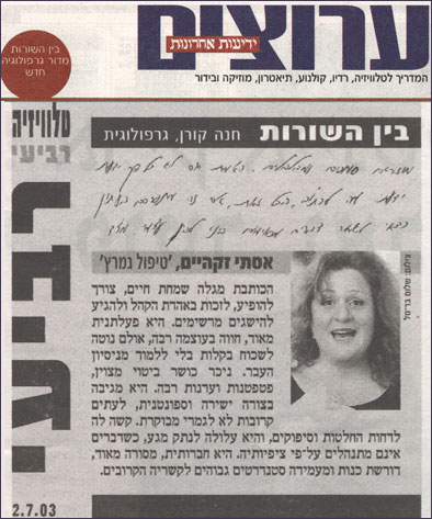 הכותבת מגלה שמחת חיים, צורך להופיע, לזכות באהדת הקהל ולהגיע להישגים מרשימים. היא פעלתנית מאוד, חווה בעוצמה רבה, אולם נוטה לשכוח בקלות בלי ללמוד מניסיון העבר. ניכר כושר ביטוי מצוין, פטפטנות וערנות רבה. היא מגיבה בצורה ישירה וספונטנית, לעיתים קרובות לא לגמרי מבוקרת. קשה לה לדחות החלטות וסיפוקים, והיא עלולה לנתק מגע, כשדברים אינם מתנהלים על פי ציפיותיה. היא חברותית, מסורה מאוד, דורשת כנות ומעמידה סטנדרטים גבוהים לקשריה הקרובים.