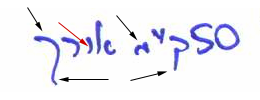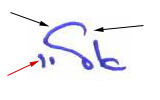 יש לשים לב שבאות ת' קיים גם תיקון. התיקון וסימנים אחרים בכתב,, כגון הצלצל המסיים של האות ת', יכולים להעלות ספק לגבי מהימנותו של הכותב. עם זאת, לאור העובדה שמדובר בטיפוס מתגונן אך בעל כישורים לא מעטים ורצון להפגין ביטחון עצמי רב (התפרסות מרשימה ביותר ובעלת נוכחות על הדף, חתימה מודגשת, תנופית, לחץ חזק) ניתן ורצוי לשאול את עצמינו האם הוא אינו מבצע "העלמת ראיות" – הוא לא מוכן שידעו שהוא "כזה". לא מוכן שידעו שהוא בעמדת מגננה ועל כן הוא מפגין ביטחון, אולי אפילו תקיף ועומד על שלו בנוקשות – ראו ל' בדוגמא ה', גם כשאינו מרגיש כל כך בטוח בעצמו.