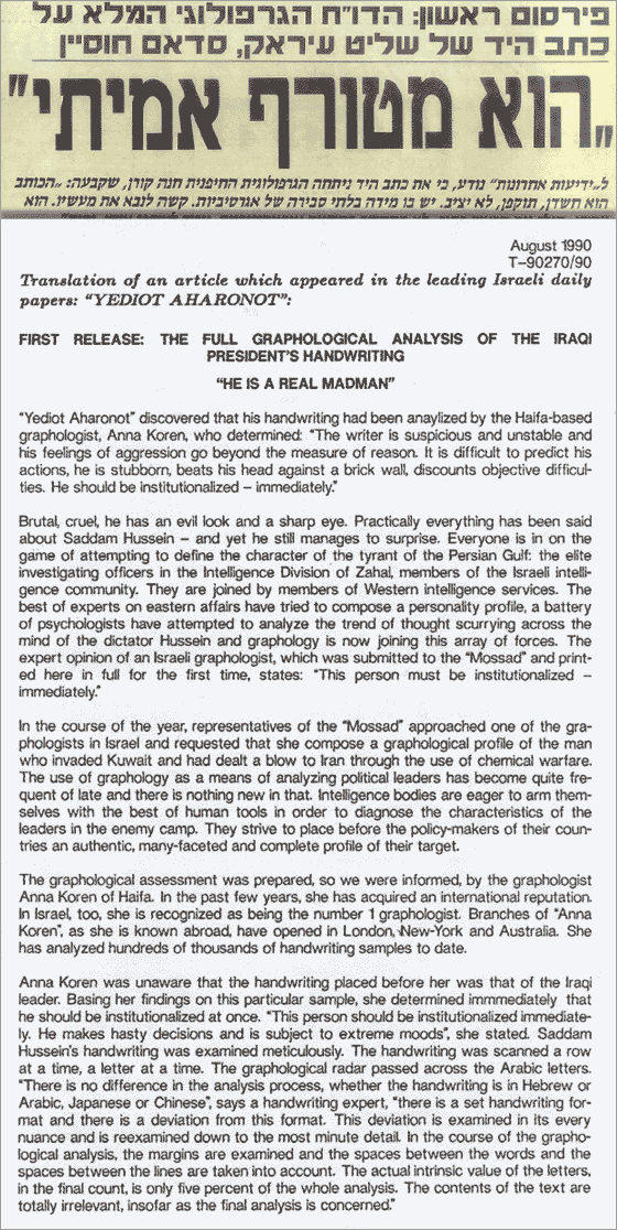 Yediot Aharonot – SADDAM HUSSEIN – He is a real madman (Translation) – Aug. 1990