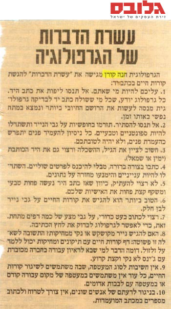הגרפולוגית חנה קורן מגישה את עשרת הדיברות להגשת קורות חיים בכתב יד:
