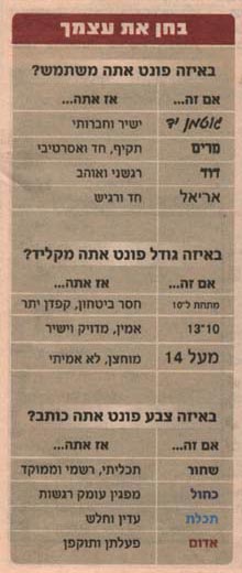 אם הפונט החביב עליכם הוא ממשפחת ה"גוטמנים" המחקים כתב יד, אתם ישירים וחברותיים. אם דווקא "מרים" היא הפייבוריטית שלכם, אתם תקיפים, חדים ואסרטיביים, זוויתיים ממש כמו הפונט. עם זאת, "דוד" הוא הפונט של הגבר החדש, פונט עגול ורגשני שמתאים למסרי אהבה וחיבה מלב אל לב. שמשהו יבשר את זה למוסדות להשכלה גבוהה, שתמיד מבקשים להגיש עבודות בפונט דוד 12.